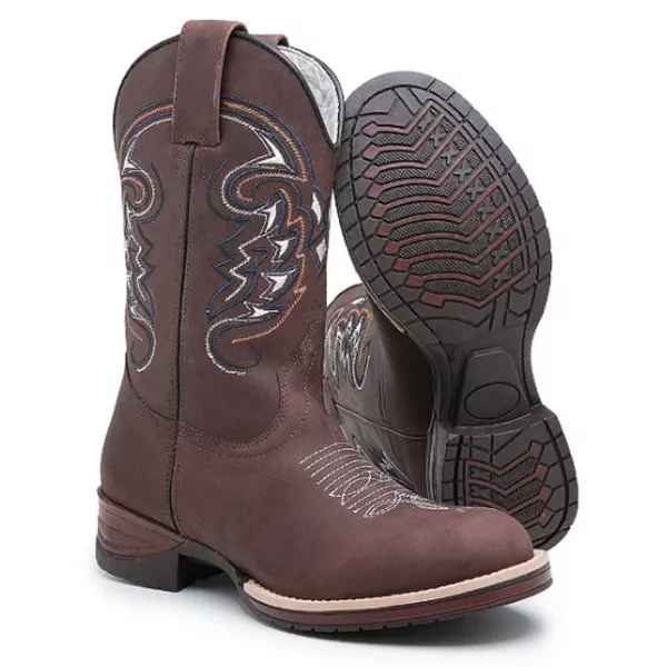 Apresentamos a nossa Bota Country Masculina com bico redondo, feita de couro genuíno com padrão artesanal e materiais premium. Cada detalhe é cuidadosamente trabalhado, desde as costuras reforçadas até a fixação do solado com colagem, pregamento e costura. O formato ergonômico garante um ajuste perfeito para o máximo conforto, proporcionando um calce ideal.