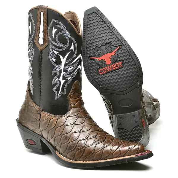 Apresentamos a nossa Bota Texana Country Masculina com bico fino, feita de couro genuíno com padrão artesanal e materiais premium. Cada detalhe é cuidadosamente trabalhado, desde as costuras reforçadas até a fixação do solado com colagem, pregamento e costura. O formato ergonômico garante um ajuste perfeito para o máximo conforto, comodidade um calce ideal.