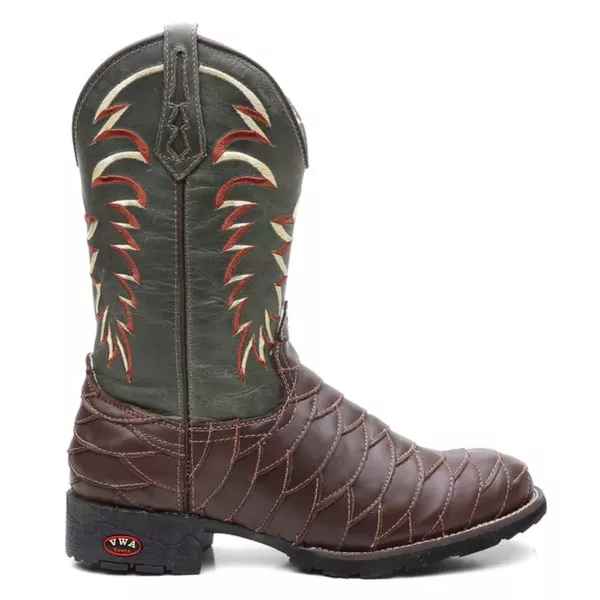 Apresentamos a nossa Bota Country Masculina com bico redondo, feita de couro genuíno com padrão artesanal e materiais premium. Cada detalhe é cuidadosamente trabalhado, desde as costuras reforçadas até a fixação do solado com colagem, pregamento e costura. O formato ergonômico garante um ajuste perfeito para o máximo conforto, proporcionando um calce ideal.