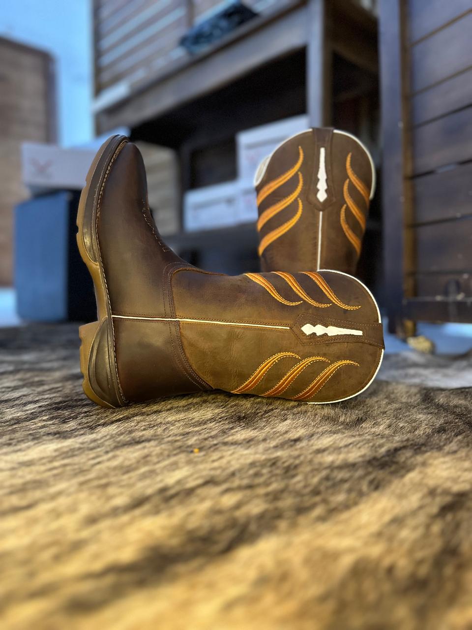 Apresentamos a nossa Bota Country Masculina com bico quadrado, feita de couro genuíno com padrão artesanal e materiais premium. Cada detalhe é cuidadosamente trabalhado, desde as costuras reforçadas até a fixação do solado com colagem, pregamento e costura. O formato ergonômico garante um ajuste perfeito para o máximo conforto, proporcionando um calce ideal.