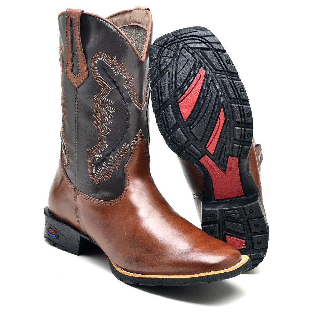 Apresentamos a nossa Bota Country Masculino com bico quadrado, com o cano feita de couro ecologico com padrão artesanal e materiais premium. Cada detalhe é cuidadosamente trabalhado, desde as costuras reforçadas até a fixação do solado com colagem, pregamento e costura. O formato ergonômico garante um ajuste perfeito para o máximo conforto, proporcionando um calce ideal.