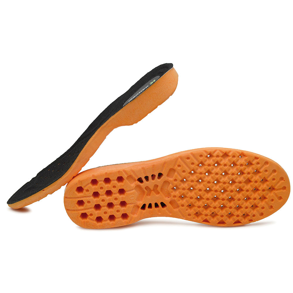 Com 25 mm de espessura na parte traseira e 15 mm na parte dianteira, nossa palmilha possui desenho anatômico com perfurações que proporciona uma absorção do impacto de toda a extensão do pé.